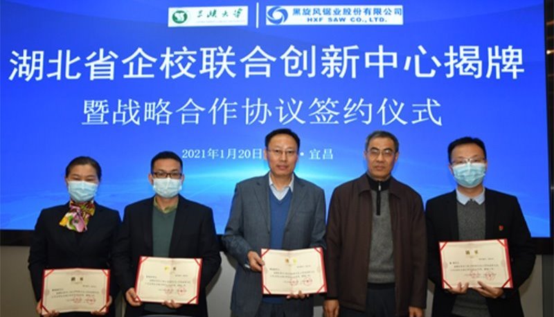 (通讯员 齐蕊/文 吴言军/图)1月20日,“湖北省制锯工程企校联合创新中心”揭牌暨战略合作协议签约仪式在行政楼一楼会议室举行。公司党委书记李建林、黑旋风锯业股份有限公司党委书记、董事长张云才出席此次仪式并为“湖北省制锯工程中心企校联合创新中心”揭牌。