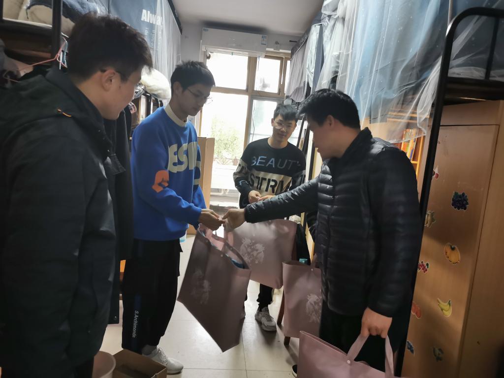 受助同学们接过老师们亲手送来的温暖棉被,纷纷表示感谢。于书记亲切地询问同学们生活上是否存在困难,并提醒同学们积极复习备考,争取期末考试取得好的成绩。向书记提醒同学们早点关注寒假返家的票务情况,做好出行规划。