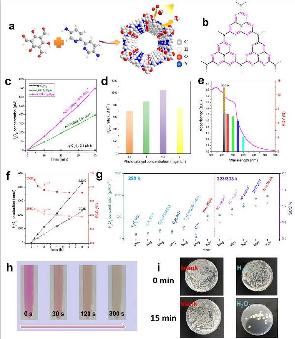 H2O2是一种绿色的氧化剂,在环境保护、化工生产、日常消毒等领域应用广泛。传统的蒽醌法合成H2O2存在高能耗和易产生有毒副产物等缺点,光催化技术虽然具备零能耗合成H2O2的优点,但是其低的2电子水氧化能力严重的抑制了由水和空气直接全合成H2O2的效率。基于此,叶立群教授发展了一种基于联吡啶构建的COF光催化剂,用于由水和空气作为原料直接光催化合成H2O2。在25度和60度下的太阳能-化学能转换效率分别达到0.57%和1.08%,8小时(1天平均日照时间)光照后的H2O2浓度超过5mM,能够直接应用于有机污染物的分解和致病性微生物的灭活。