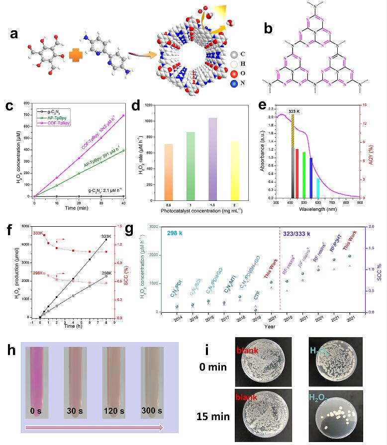 H2O2是一种绿色的氧化剂,在环境保护、化工生产、日常消毒等领域应用广泛。传统的蒽醌法合成H2O2存在高能耗和易产生有毒副产物等缺点,光催化技术虽然具备零能耗合成H2O2的优点,但是其低的2电子水氧化能力严重的抑制了由水和空气直接全合成H2O2的效率。基于此,叶立群教授发展了一种基于联吡啶构建的COF光催化剂,用于由水和空气作为原料直接光催化合成H2O2。在25度和60度下的太阳能-化学能转换效率分别达到0.57%和1.08%,8小时(1天平均日照时间)光照后的H2O2浓度超过5mM,能够直接应用于有机污染物的分解和致病性微生物的灭活。