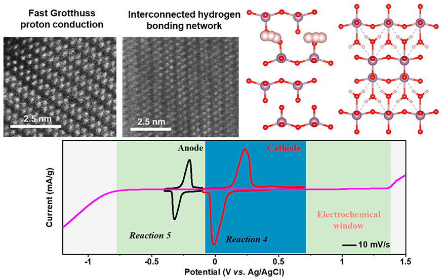 理想的电化学储能器件是在最小的体积内以最短的时间储存大量的能量,载流子质量越低,其理论能量密度就越高。因此,质子被认为是高能量和高倍率电化学储能器件最理想的载流子。但是,因基于质子的电化学储能器件通常都含有强酸性电解液导致其电极选择范围较少,反应机制也不完善。有鉴于此,该团队首次提出在电化学活化的H1.75MoO3纳米带中实现基于Grotthuss Mechanism、无扩散过程且快速的质子传输。同时,电化学活化的H1.75MoO3纳米带中存在Jahn-Teller效应导致的电子-声子耦合而呈现金属态。本文利用阿伦尼乌斯方程成功验证了无机材料H1.75MoO3体相内部与电极/电解液界面超低的能垒,同时利用DFT辅助验证了无机材料中的Grotthuss机制。这一结果展现了基于质子无需扩散过程的Grotthuss机制的电化学储能器件的未来大规模应用的巨大潜力。本文工作得到国家自然科学基金、能源和环境材料化学学科创新引智基地、无机非金属晶态与能源转换材料重点实验室的支持。