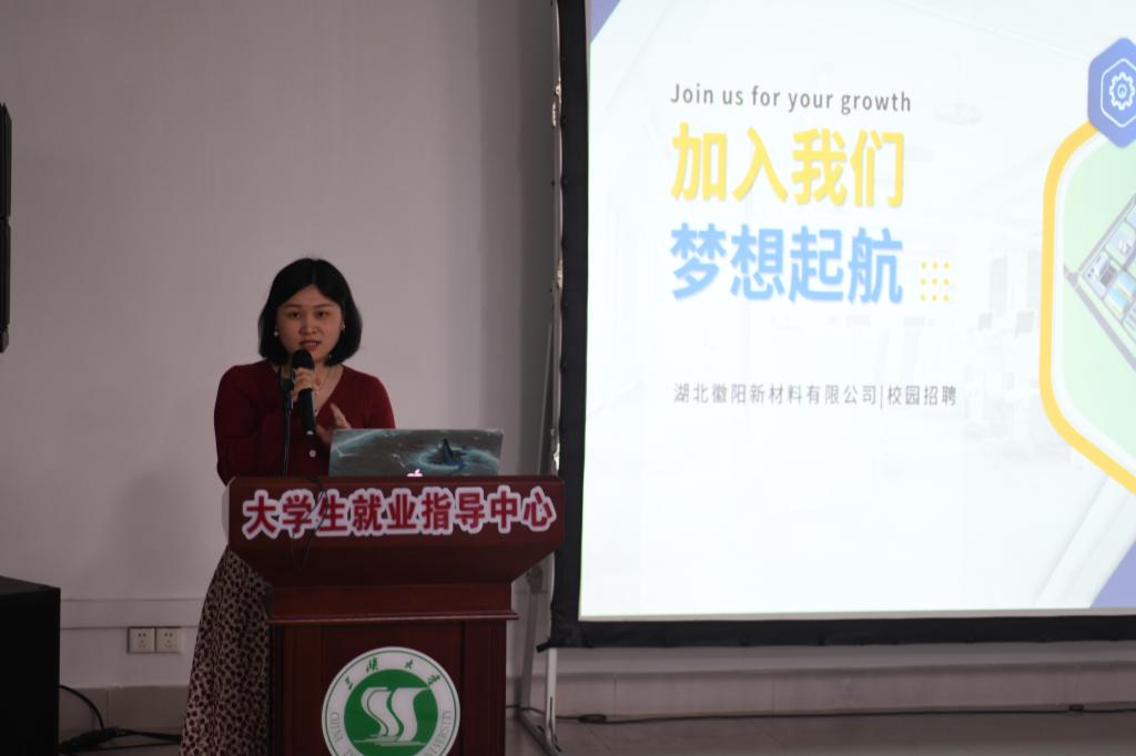 当天下午,当阳市联合材化学院在学校招聘大厅举办了专场招聘会,市属12家优质企业提供了近40个岗位,招聘计划达210余人。专场招聘会由“当阳人才引进1+3政策宣传片”引入,详细介绍了当阳市的人才新政、投资兴业、创新创业等方面的战略规划,全方位呈现了当阳市的人才优待政策,向在场的同学展现了当阳市求才若渴的满满诚意,吸引了包括8455线路检测中心、生物与制药学院、机械与动力学院、科技学院等多个学院不同专业毕业生的积极参与。本次随团调研的8455线路检测中心96级员工、当阳市高新区管委会主任沈乐明还应邀与材化学院员工代表进行了如何在专业道路上努力成长成才的分享。